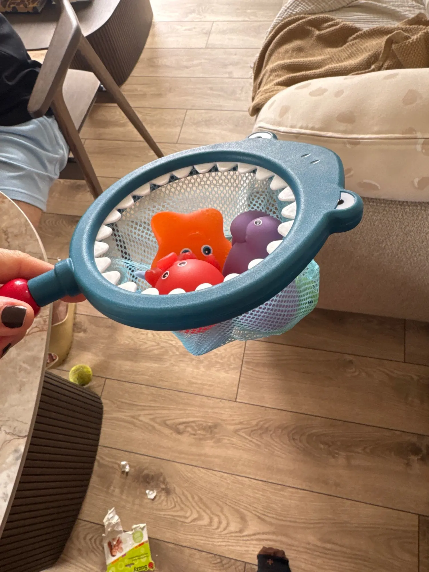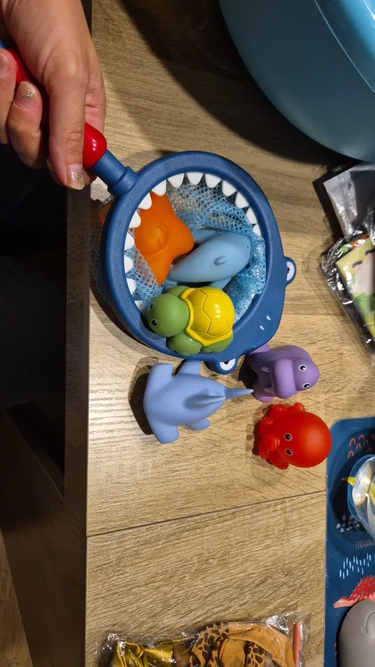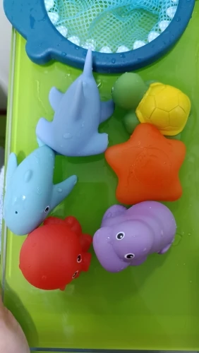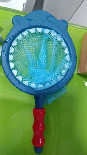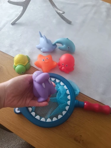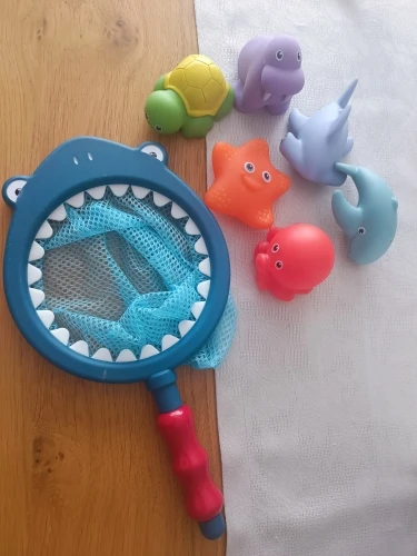 The item has met my expectations. The size of the toys is suitable for a one-year-old child; they are not too small nor too big, and all have a hole for spitting water. The net is large and weighs a little but enough for a child to hold it well. I liked it a lot.