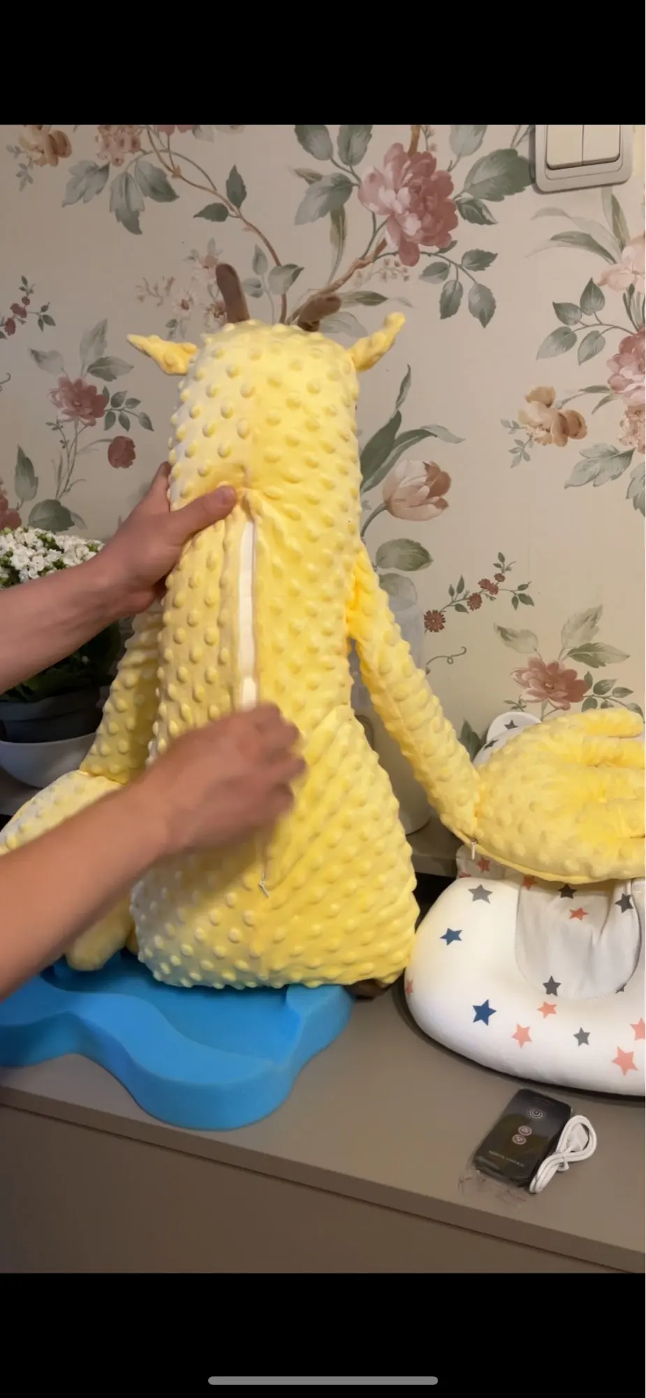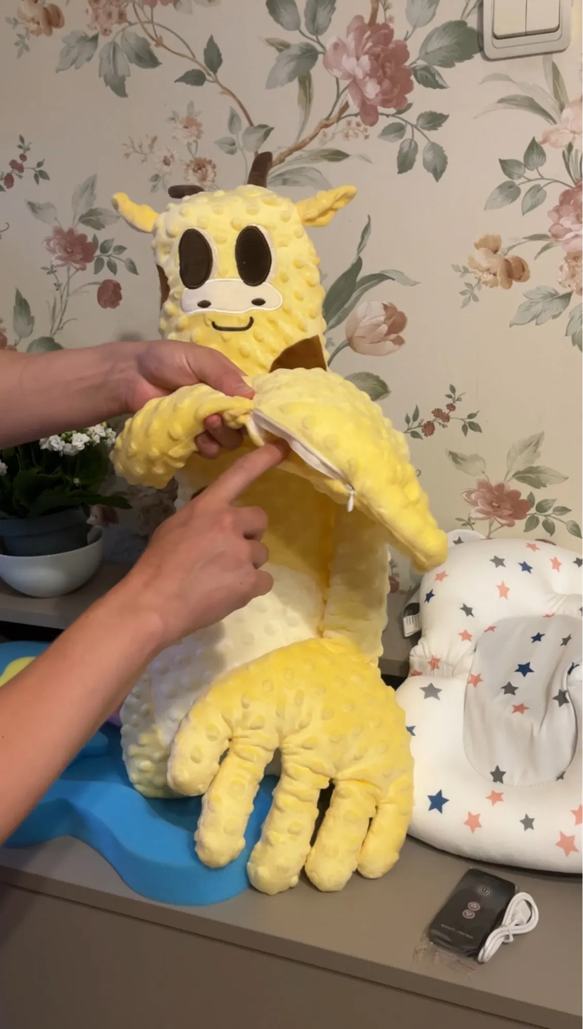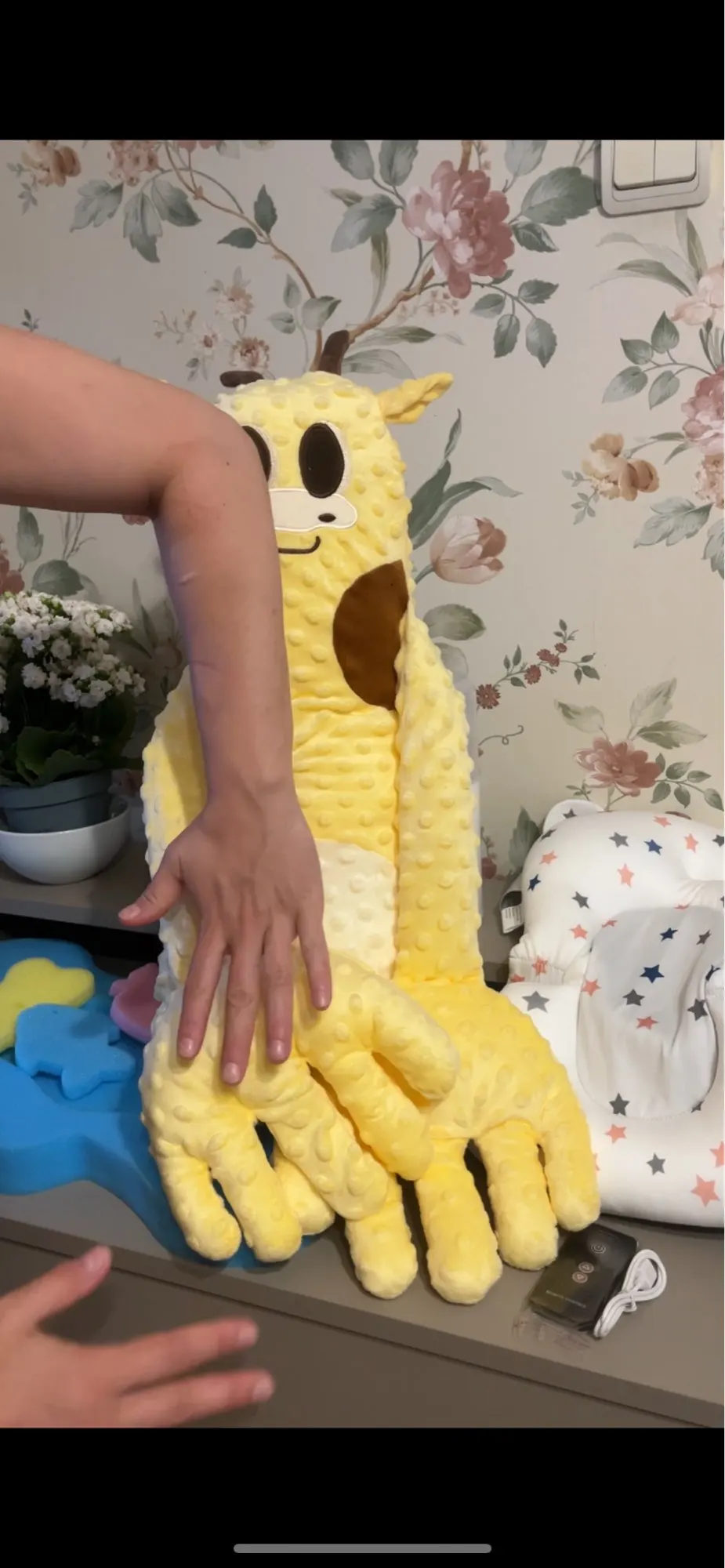Made from premium cotton and polyester, it’s soft, breathable, and safe for sensitive skin. The cute cartoon design and calming hand palms create a cozy, reassuring environment — perfect for nap time, bedtime, or quiet cuddles.